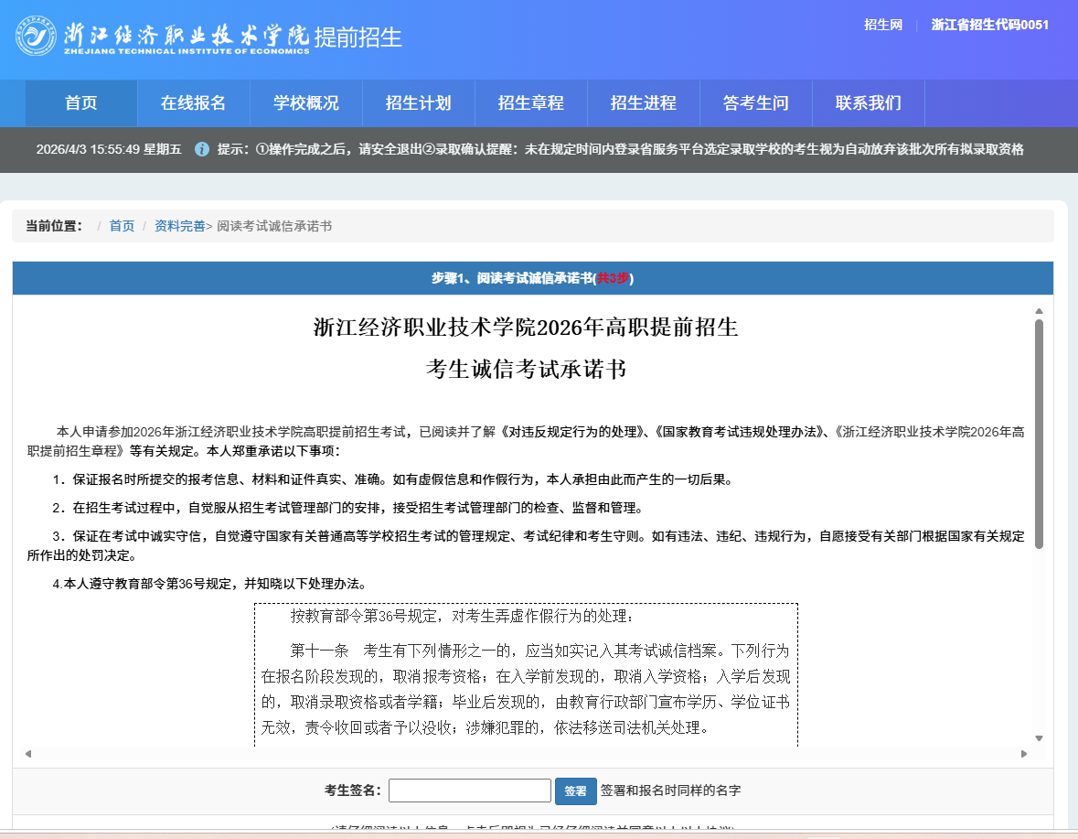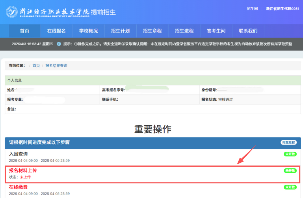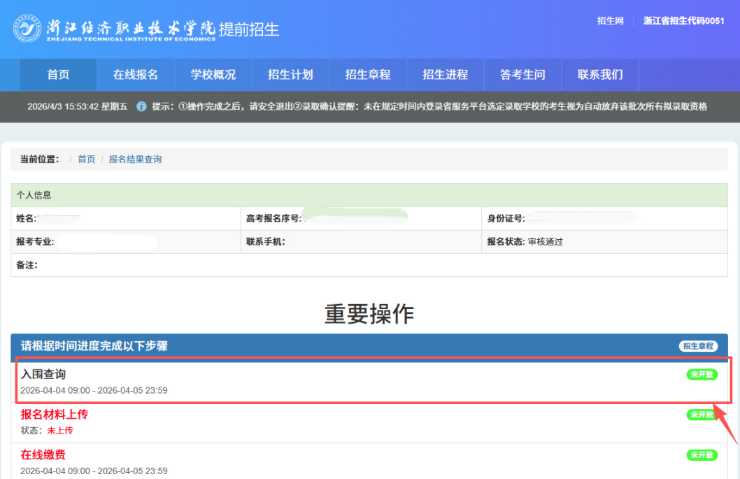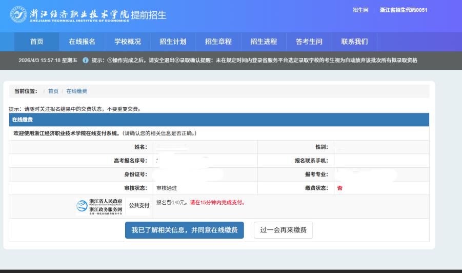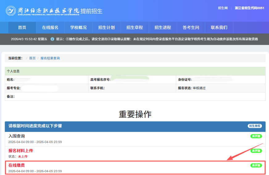 根据《浙江经济职业技术学院2026年提前招生章程》日程安排,现进入成绩查询与反馈阶段,后续将进入缴费、材料上传、准考证打印、综合测评等环节。请各位考生务必密切关注各环节时间节点,以免因逾期操作而影响后续资格,造成遗憾。现将有关事项通知如下: