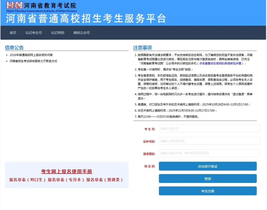 考生于2026年4月10日9:00至4月11日18:00,登录“河南省普通高校招生考生服务平台”(https://pzwb.haeea.cn)进行对口招生网上志愿填报。