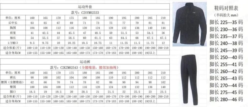 学校统一提供军训服(含上衣、裤子、帽子、鞋),前往2号教学楼室内篮球馆,出示现场报到二维码领取军训服。请参照以下尺码表提前确认所需尺寸,下附衣服及鞋子尺码表: