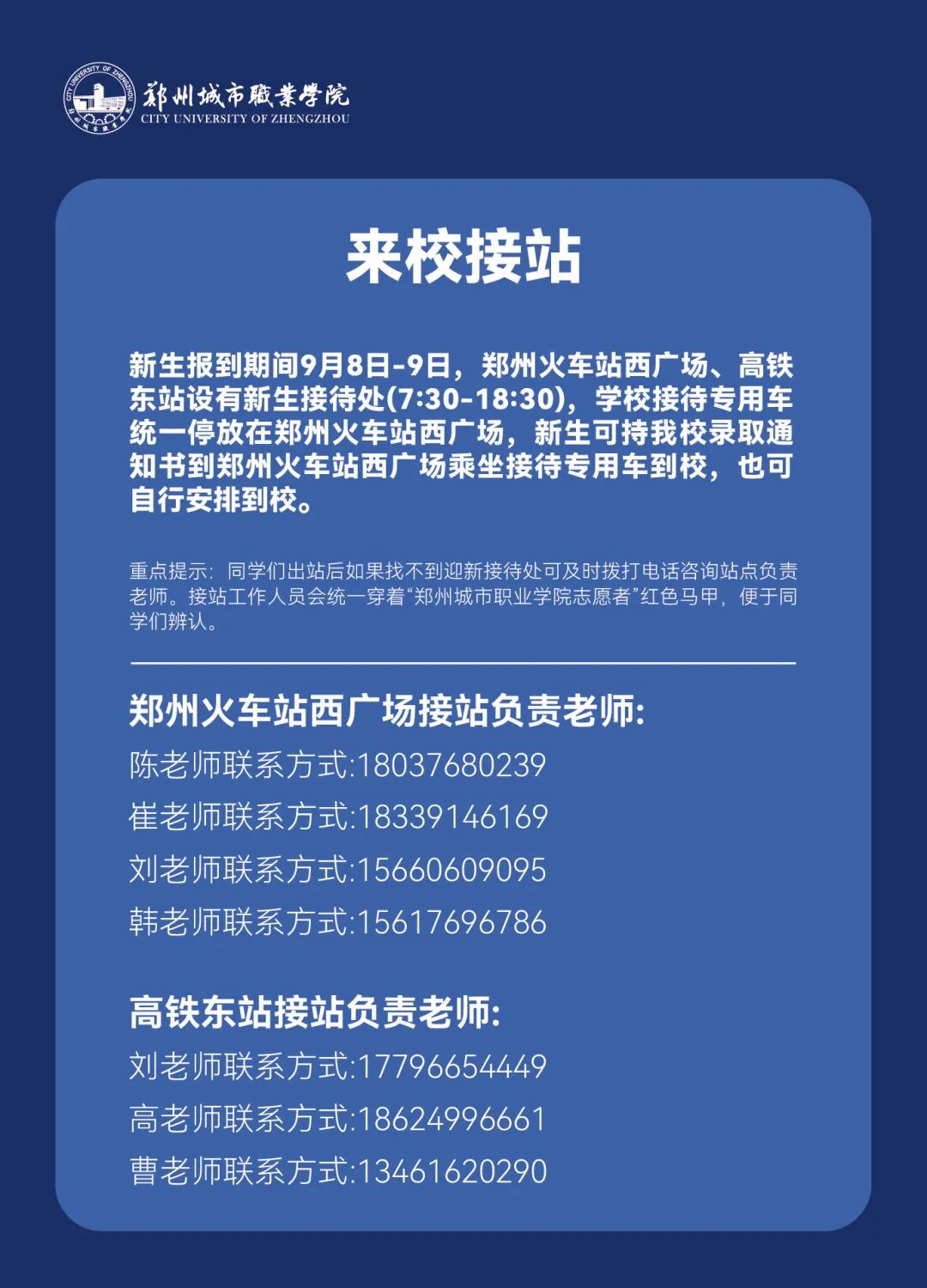 新生报到期间9月8日-9日,郑州火车站西广场、高铁东站设有新生接待处(7:30-18:30),学校接待专用车统一停放在郑州火车站西广场,新生可持我校录取通知书到郑州火车站西广场乘坐接待专用车到我校,也可自行安排到校。
