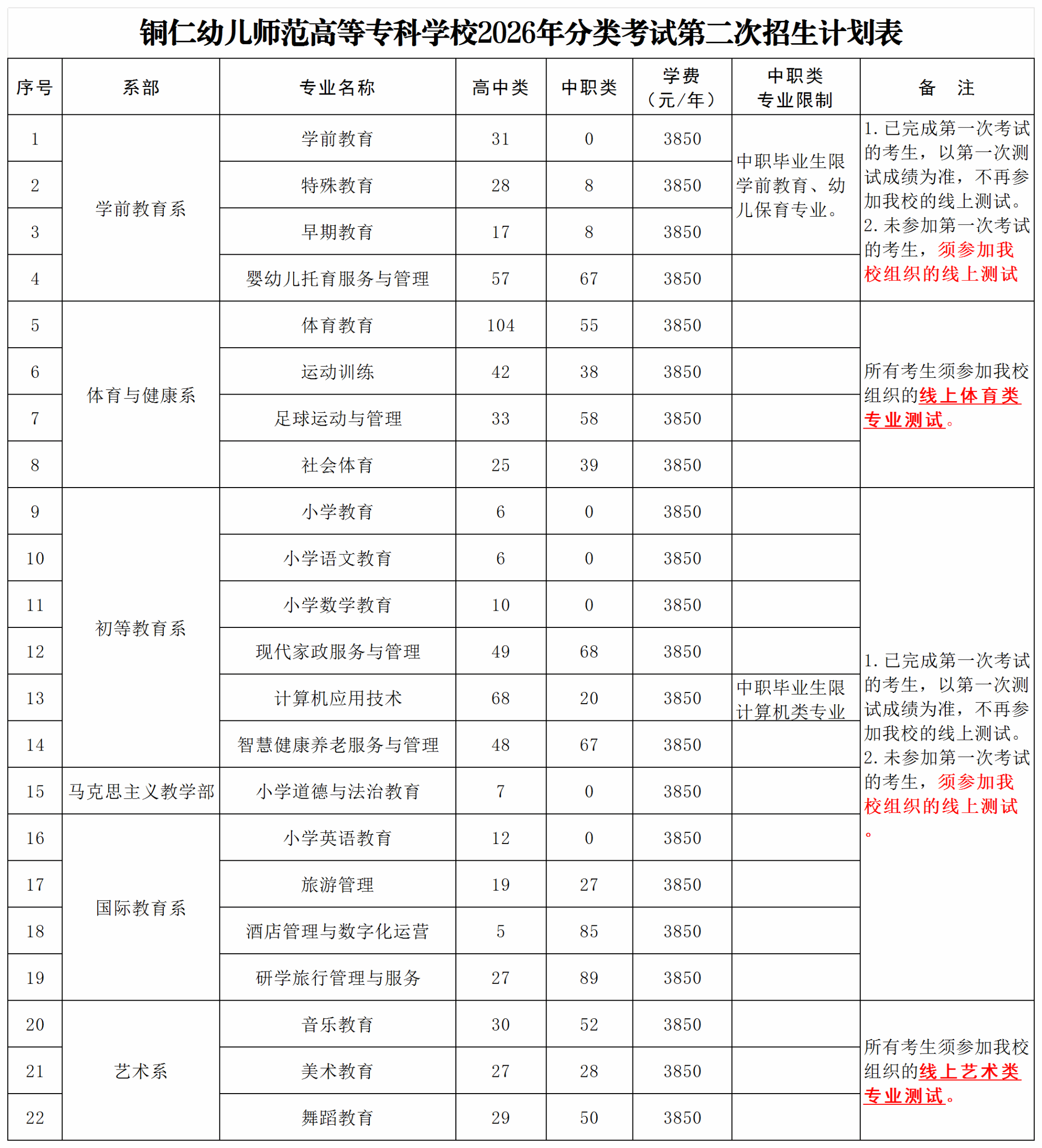 铜仁幼儿师范高等专科学校2026年分类考试第二次招生计划如下,具体以省招生考试院公布的2026年贵州省高职(专科)分类考试院校第二次招生专业缺额计划统计表为准。