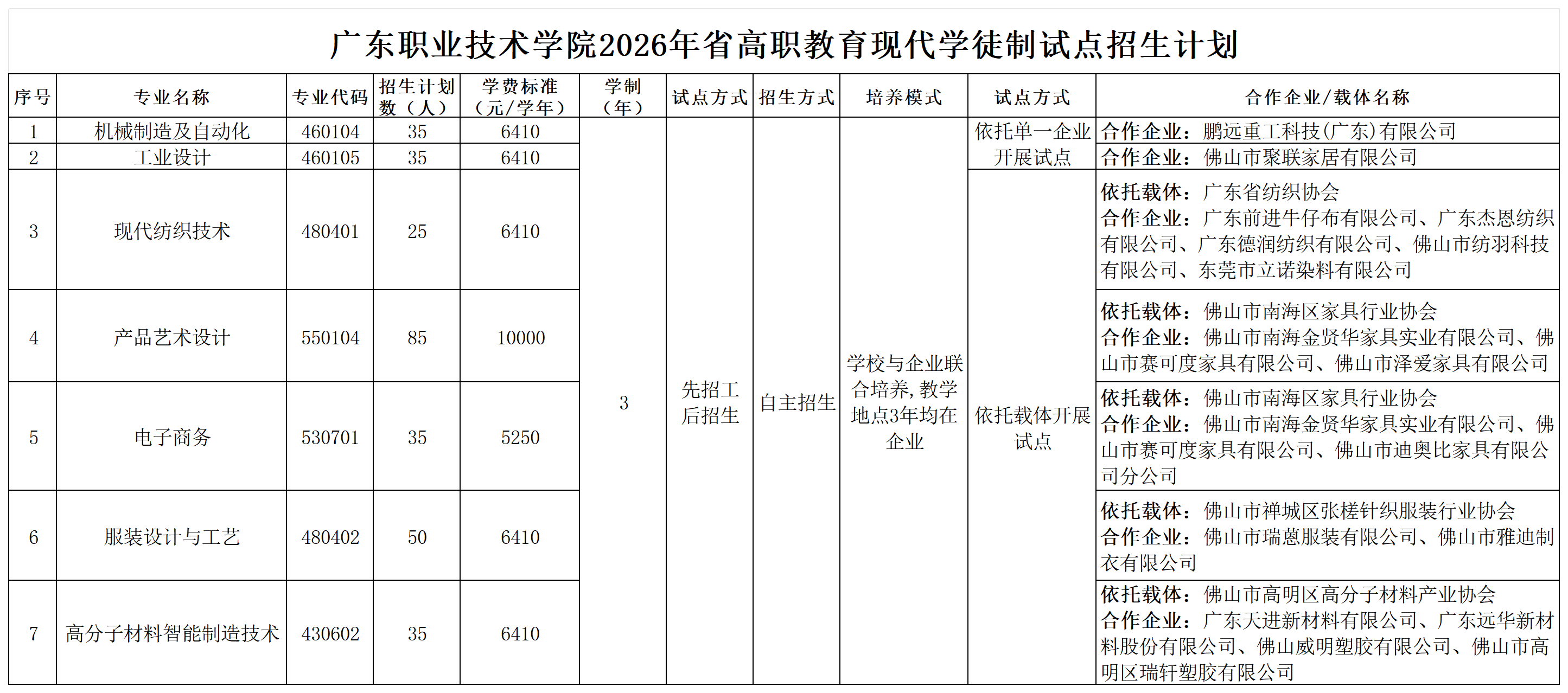根据广东省教育厅《关于做好2026年省高职教育现代学徒制试点工作的通知》(粤教职函〔2026〕1号),我校2026年获批7个专业点开展高职教育现代学徒制试点,招生计划数共计300人。