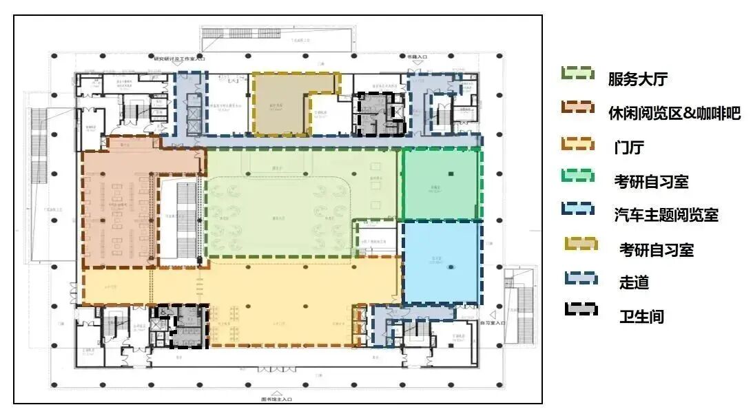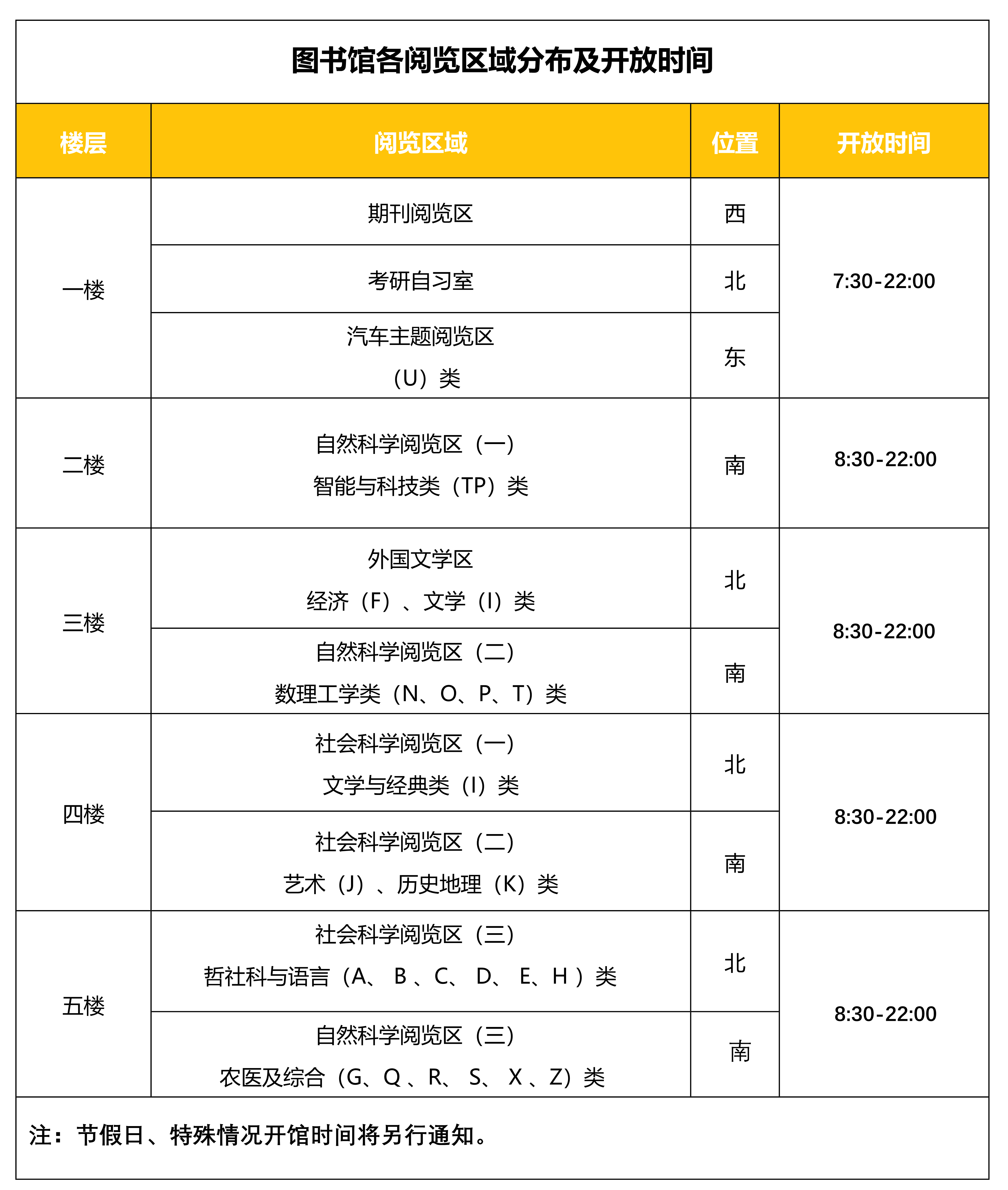 周一至周五:8:20 - 22:00;周六至周日:9:00 - 22:00; 图书馆依据《中国图书分类法》与馆内空间结构,设有10个阅览区域,包括社科类、自科类、特色专业类(如汽车类)、报纸期刊阅览区域、新书展览区域及各种主题书展区域等,满足不同读者的需求。