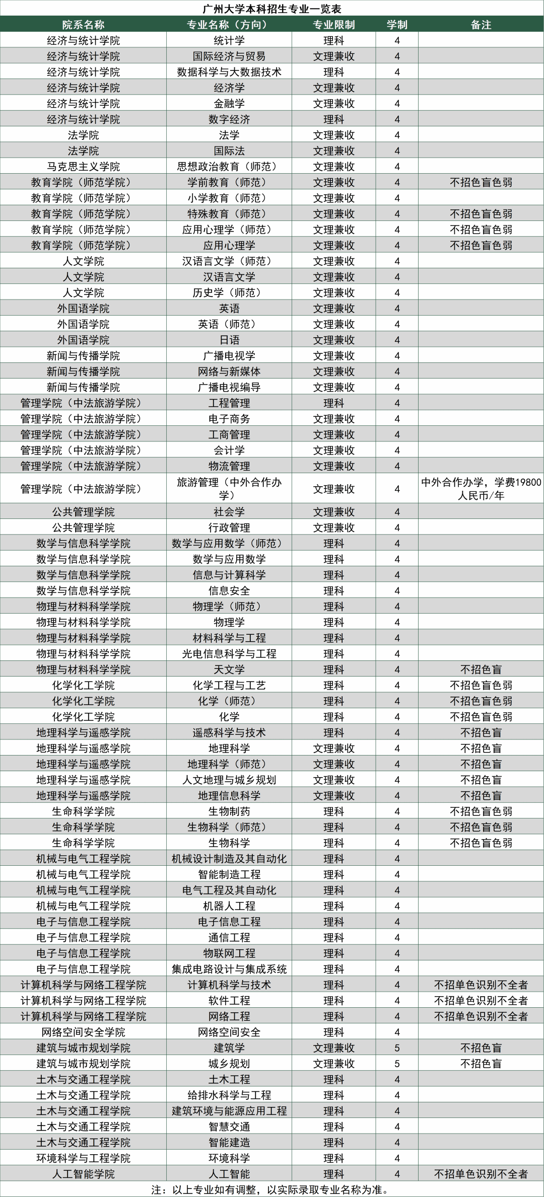 广州大学本科招生专业一览表