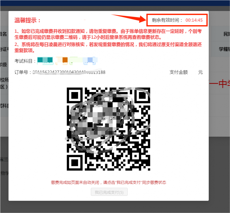 如未缴费,或缴费不成功,当前页面需等“剩余有效时间”结束(或刷新页面)才能关闭。