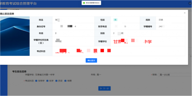 第四步:若无个人照片需要考生自己手动上传(图像信息要求:考生本人正面免冠彩色头像, 头部占照片尺寸的2/3,背景颜色为白色,像素不小于240×320,高宽比为4:3,文件大小不得超过20K,照片要求使用身份证号命名,照片为JPEG格式。);户籍地址栏需按户口簿地址正确填写;选择班级【确认班级选择无误】(图7)——选择考试科目——系统会提示个人信息及报考信息,确认信息无误后,点击“确认提交”(图8)——弹出再次确认框(图9)。点击“确定”后进入缴费环节(图10)。