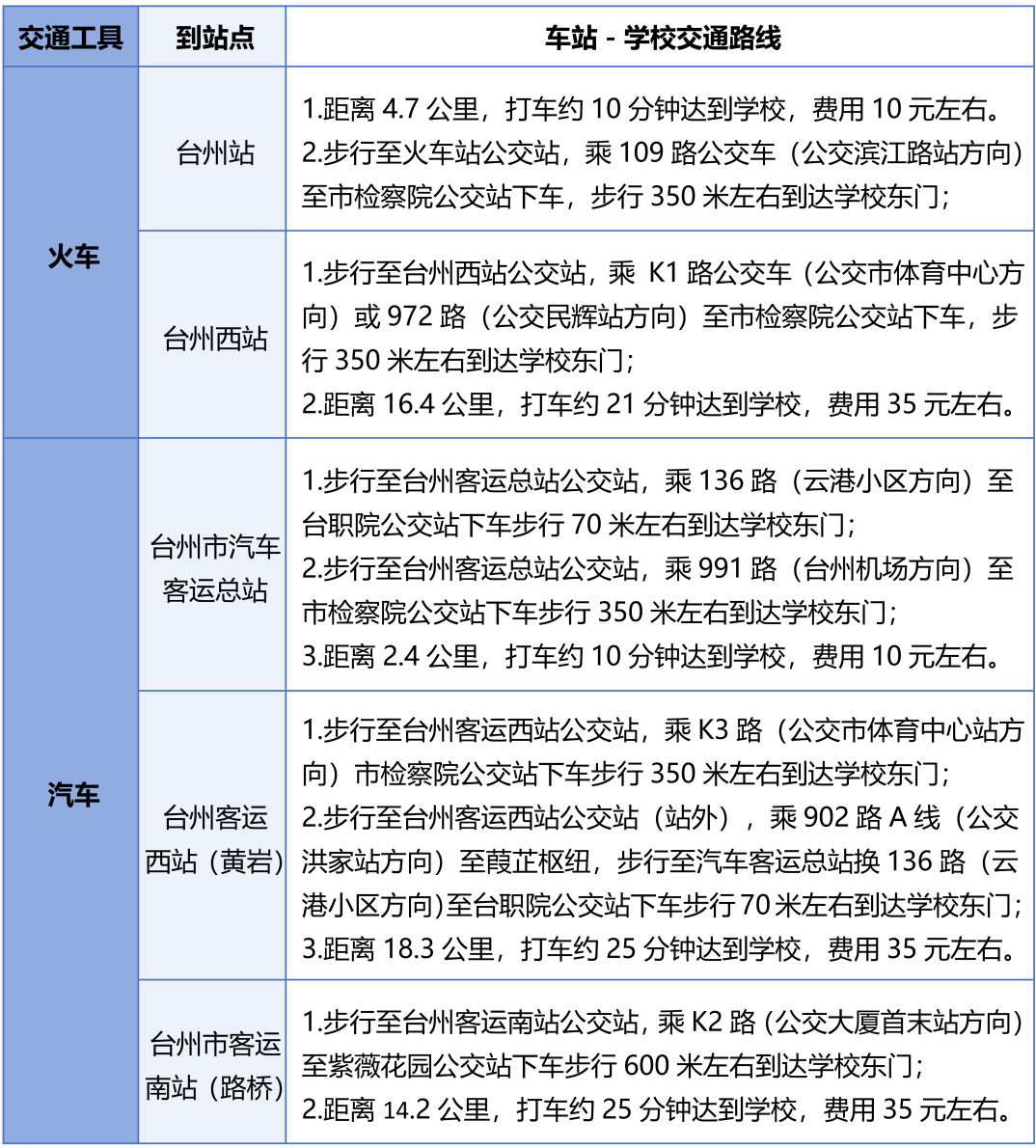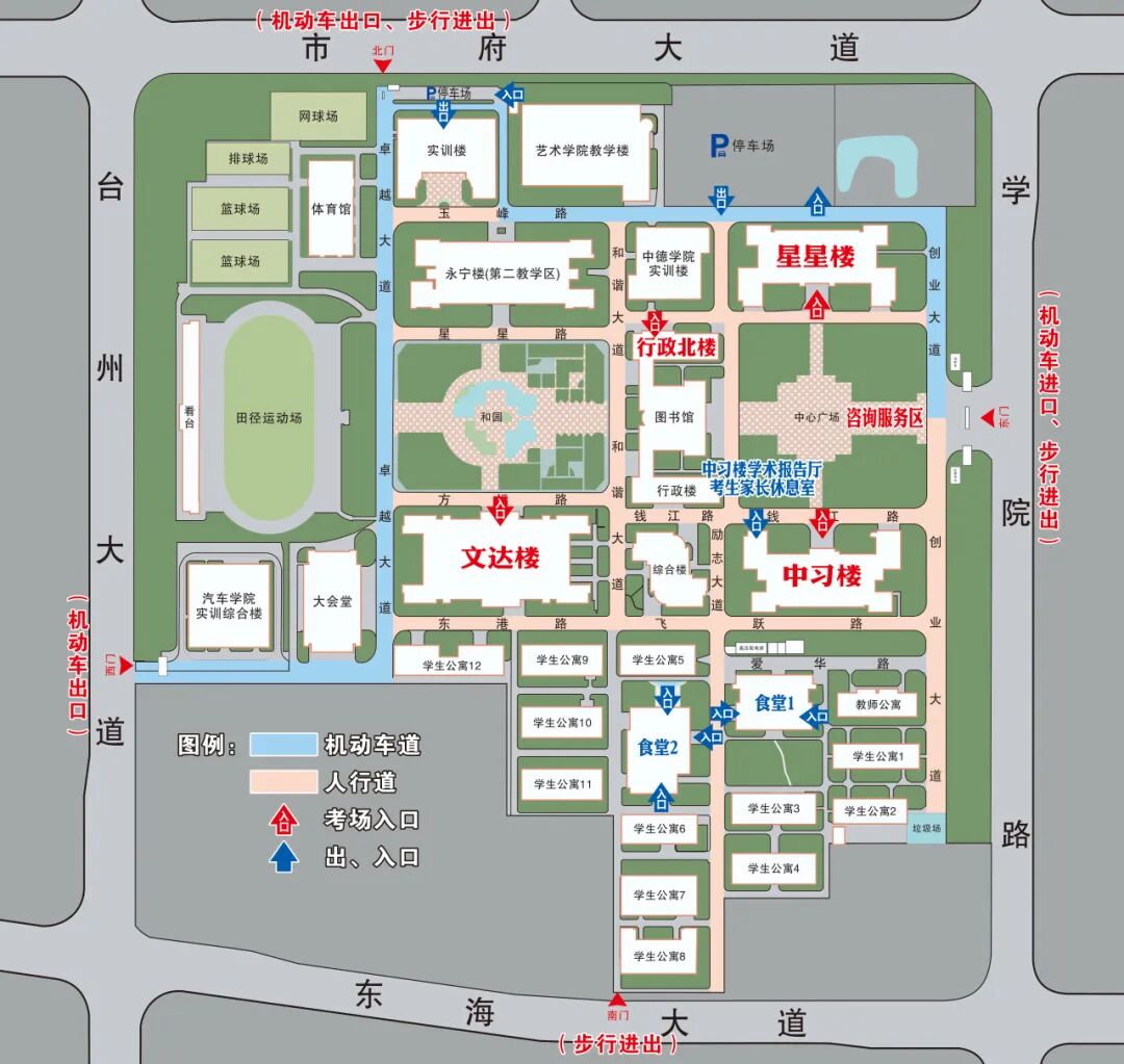 (三) 建议各位考生合理安排出行时间,尽量选择绿色出行,以避免因交通问题而耽误考试。若有随行车辆,请服从学校的统一调度与安排。车辆统一从学校东门进入,可从学校西门、北门驶出。当校内停车位已满时,将暂时禁止车辆进入校园,可停放到校园南侧的台州市体育中心停车场(体育中心东门、北门均可进入)。