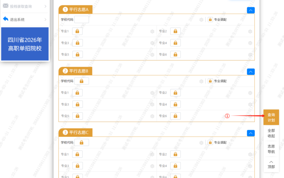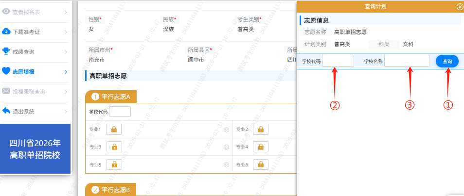 在图3中点击左侧功能菜单标记①“志愿填报”,进入批次选择页。