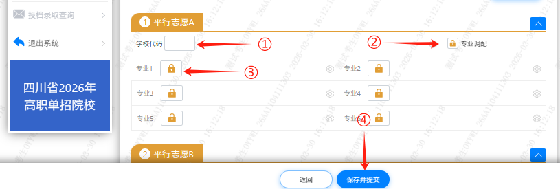根据查询到的计划信息,在图11填写志愿页面中填写志愿信息。依次填写标记①学校代码,选择是否勾选标记②专业调配(勾选表示服从专业调配,不勾选表示不服从专业调配),再依次填写标记③专业代码,其他平行志愿填写以此类推。填写完成后,点击下方标记④“保存并提交”按钮,保存并提交当前志愿。填写后准备点击“保存并提交”按钮的志愿如图12所示。