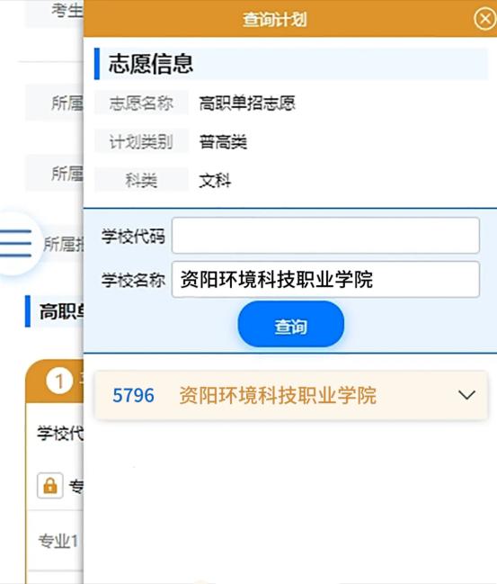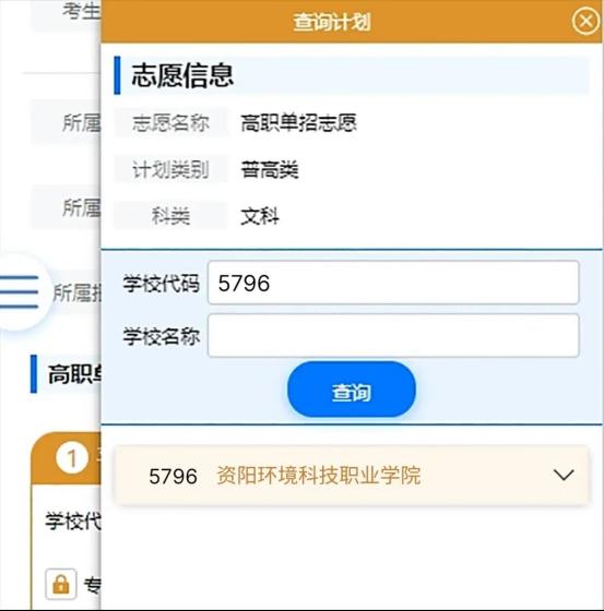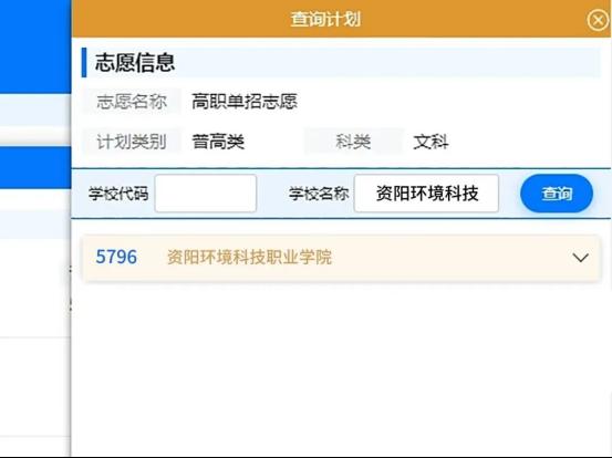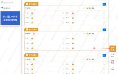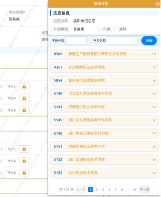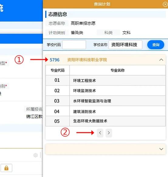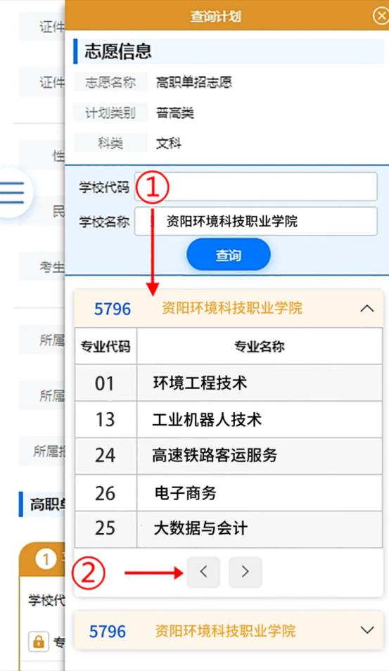 在图10中点击标记①院校标题,展开当前院校的专业代码和专业名称。点击标记②左右翻页按钮查看当前院校的所有专业代码及专业名称。