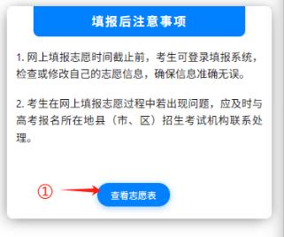 仔细阅读图16填报后注意的事项内容后,可点击标记①“查看志愿表”按钮进入查看志愿页面。查看志愿页面如图17所示。