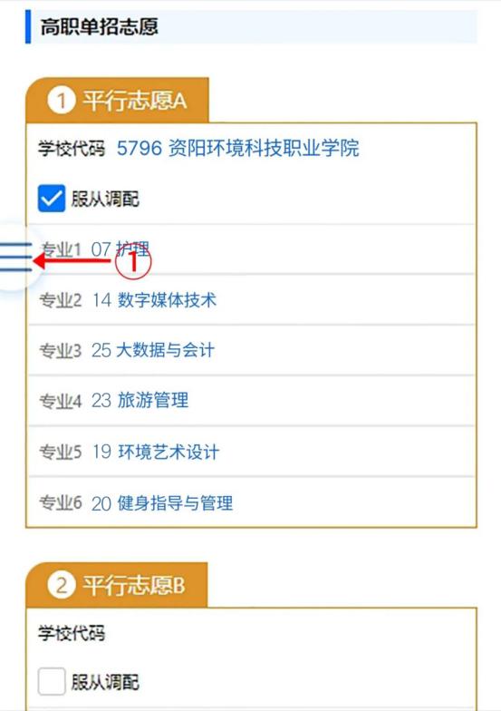 在图3中点击左上方标记①悬浮菜单图标,打开菜单。菜单展开后,点击图4中标记①“志愿填报”进入批次选择页。