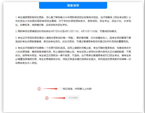 在图2中仔细阅读填报须知,勾选标记①“我已阅读,并同意以上内容”,待标记②“开始填报”按钮可用后,点击“开始填报”按钮,进入个人信息页。