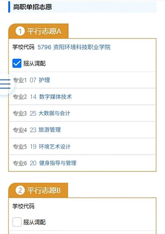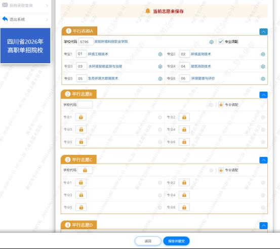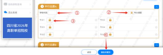 根据查询到的计划信息,在图11填写志愿页面中填写志愿信息。依次填写标记①学校代码,选择是否勾选标记②专业调配(勾选表示服从专业调配,不勾选表示不服从专业调配),再依次填写标记③专业代码,其他平行志愿填写以此类推。填写完成后,点击下方标记④“保存并提交”按钮,保存并提交当前志愿。填写后准备点击“保存并提交”按钮的志愿如图12所示。