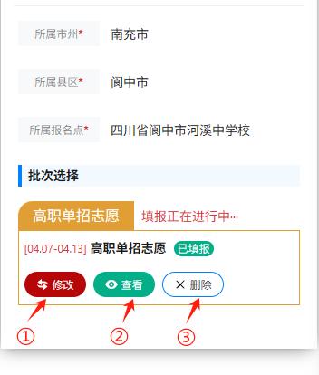 如需修改志愿表以及查看志愿表,可以点击如图16中左侧功能菜单标记①“志愿填报”,找到当前批次标题,点击右侧标记②“修改”按钮修改志愿,点击标记③“查看”按钮查看志愿,点击标记④“删除”按钮删除当前填写的志愿。