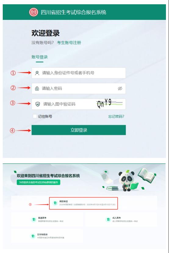 依次在图1中标记①输入身份证件号或者手机号,在标记②正确填写密码,在标记③正确输入图片中的验证码,④“登录”按钮可用后点击“立即登录”按钮,登录系统。登录成功后点击标记⑤,进入高职单招志愿填报系统。