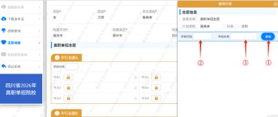 在图12中点击标记①院校标题,展开当前院校的专业代码和专业名称。点击标记②左右翻页按钮查看当前院校的所有专业代码及专业名称。