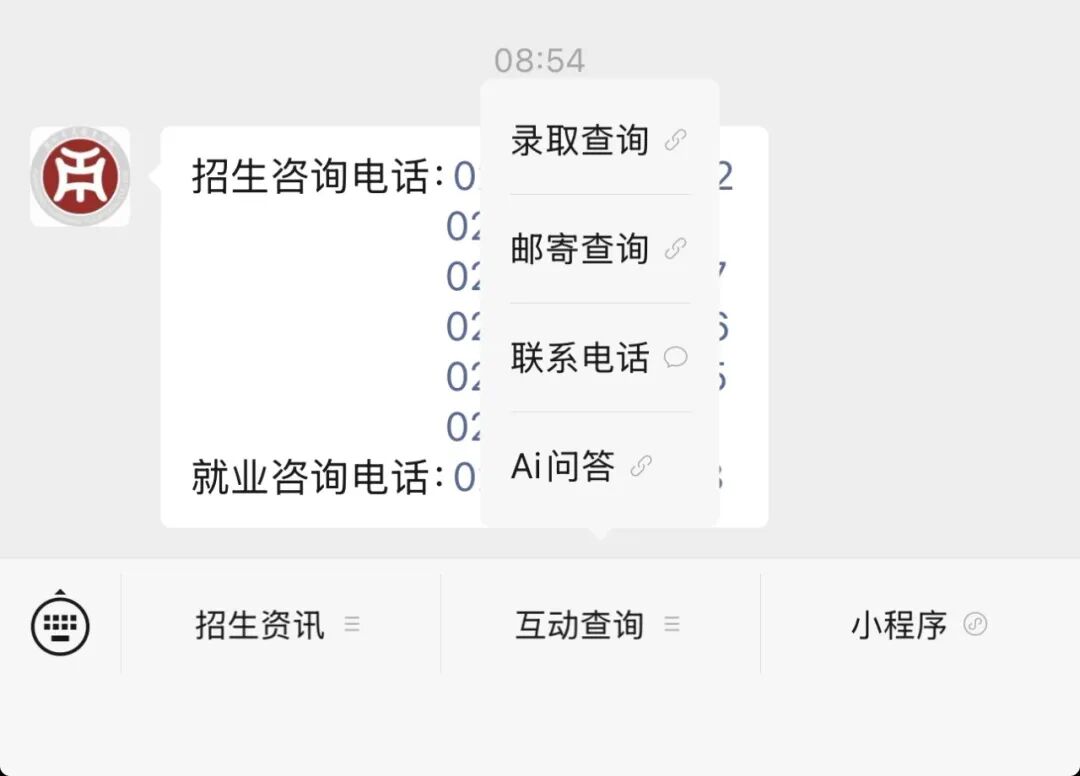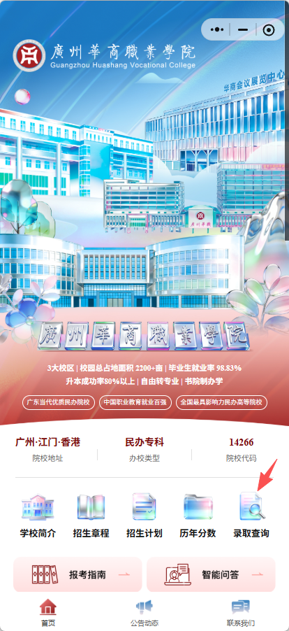 - 点击下方图片即可跳转至我校招生小程序往下滑动即可看到录取查询跳转按钮