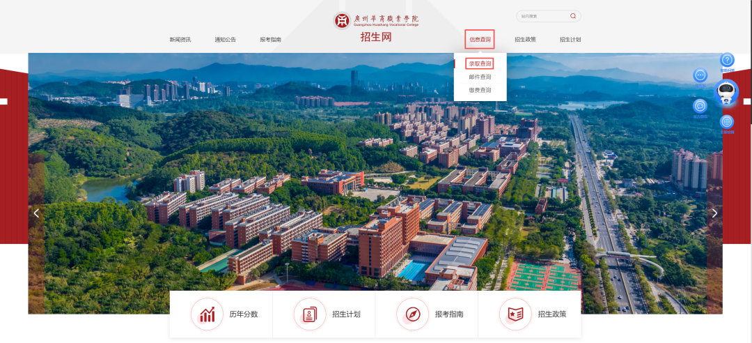 2. 进入广州华商职业学院招生网→点击信息查询→录取查询→输入姓名、身份证号、准考证号(10位数,可在志愿填报系统查询)和验证码,点击查询录取信息。