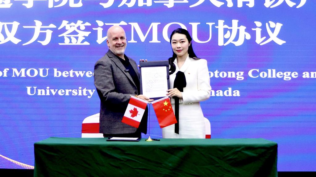 14时,两校在科研楼四层多功能厅举行签约仪式。王忆宁副校长代表学校与加拿大滑铁卢大学雷尼森大学学院正式签署合作备忘录,明确了双方在学生交流、暑期研学、课程资源共享等方面的合作方向与具体内容。校团委大艺团带来精彩的器乐表演,寓意两校友谊绵长、合作蒸蒸日上。签约后,双方共同为“海外优质生源基地”揭牌,标志着我校在拓展国际生源渠道、推进国际化人才培养方面迈出了重要一步,两校合作进入实质性推进阶段。