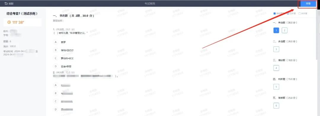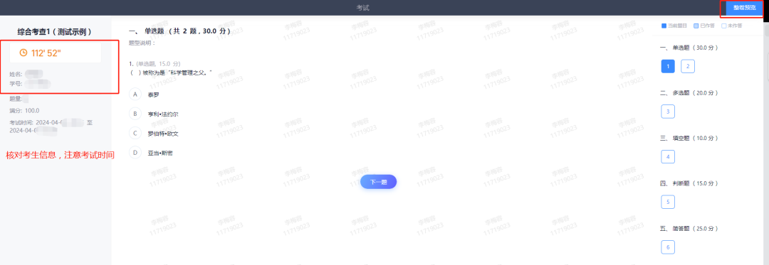 5.进入考试页面,开始考试。完成所有试题后,点击右上角处“整卷预览”。