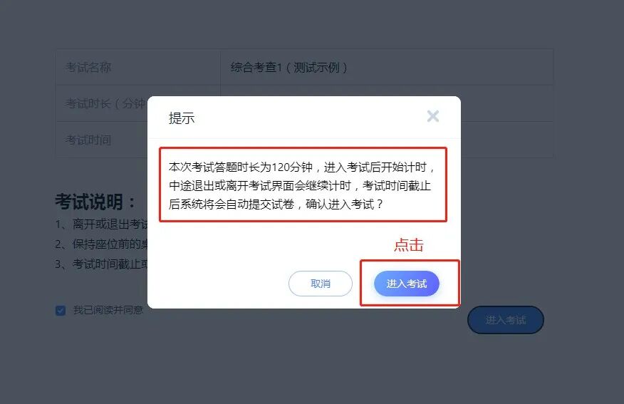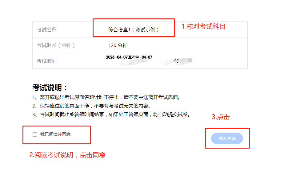 3.核对考试科目,阅读考试说明,点击“进入考试”按钮。