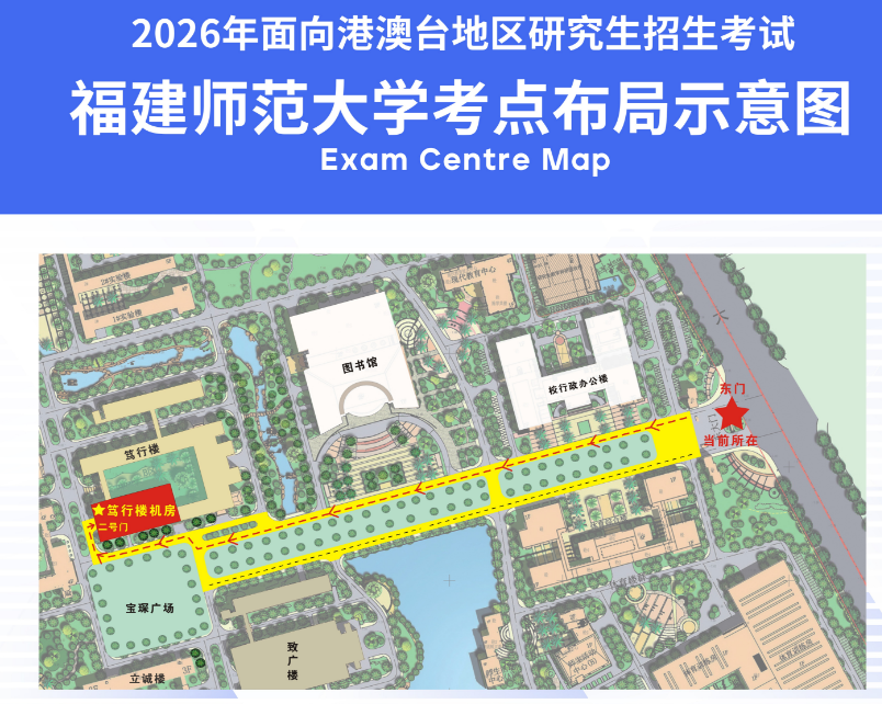 所有考生均从福建师范大学旗山校区东门步行进入学校,从笃行楼二号门经安检后进入考点。考生随行人员及车辆一律不得进入考点。考生向门卫出示纸质准考证或报名时使用的有效身份证件原件后入校。