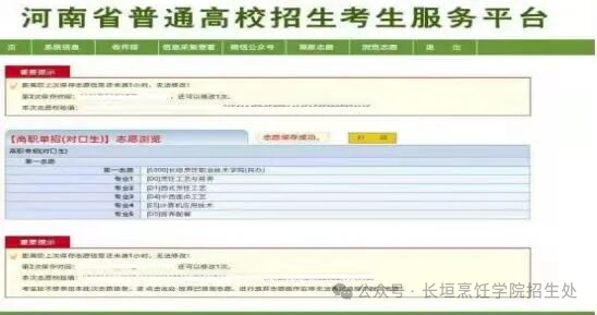 志愿保存成功,志愿才有效。志愿保存成功后,在规定的时间内考生还能修改志愿。志愿保存成功,菜单“填报志愿”会变成“浏览志愿”,工作进度的“点击填报”会变成“点击查看”,同时,工作进度下方的收件箱——个人信息中会收到一条信息。考生在志愿填报前一定要认真查看我院招生章程,了解专业招生计划和收费标准等。