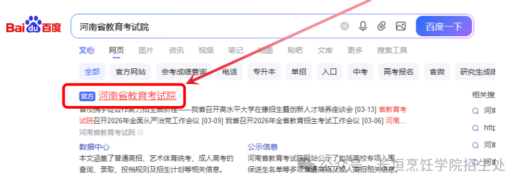 考生登录河南省教育考试院官网(http://www.haeea.cn/),或在搜索引擎中输入“河南省教育考试院”,点击带有“官方”标识的网站。