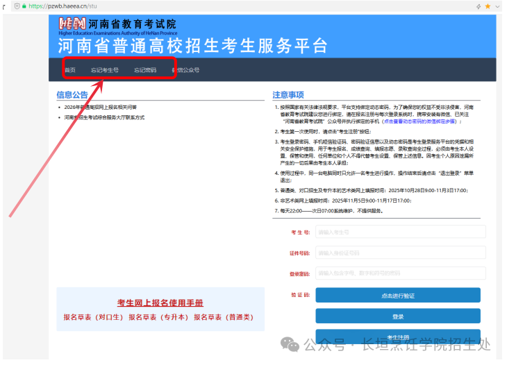 进入考生服务平台后,请仔细阅读“信息公告”区、“注意事项”区发布的政策公告和注意事项。