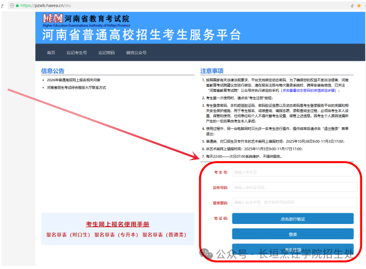 点击跳转进入河南省教育考试院官网,点击如下图所示位置,进入“河南省普通高校招生考生服务平台”(https://pzwb.haeea.cn/)系统。