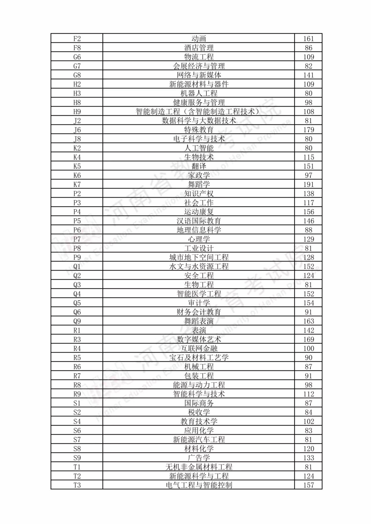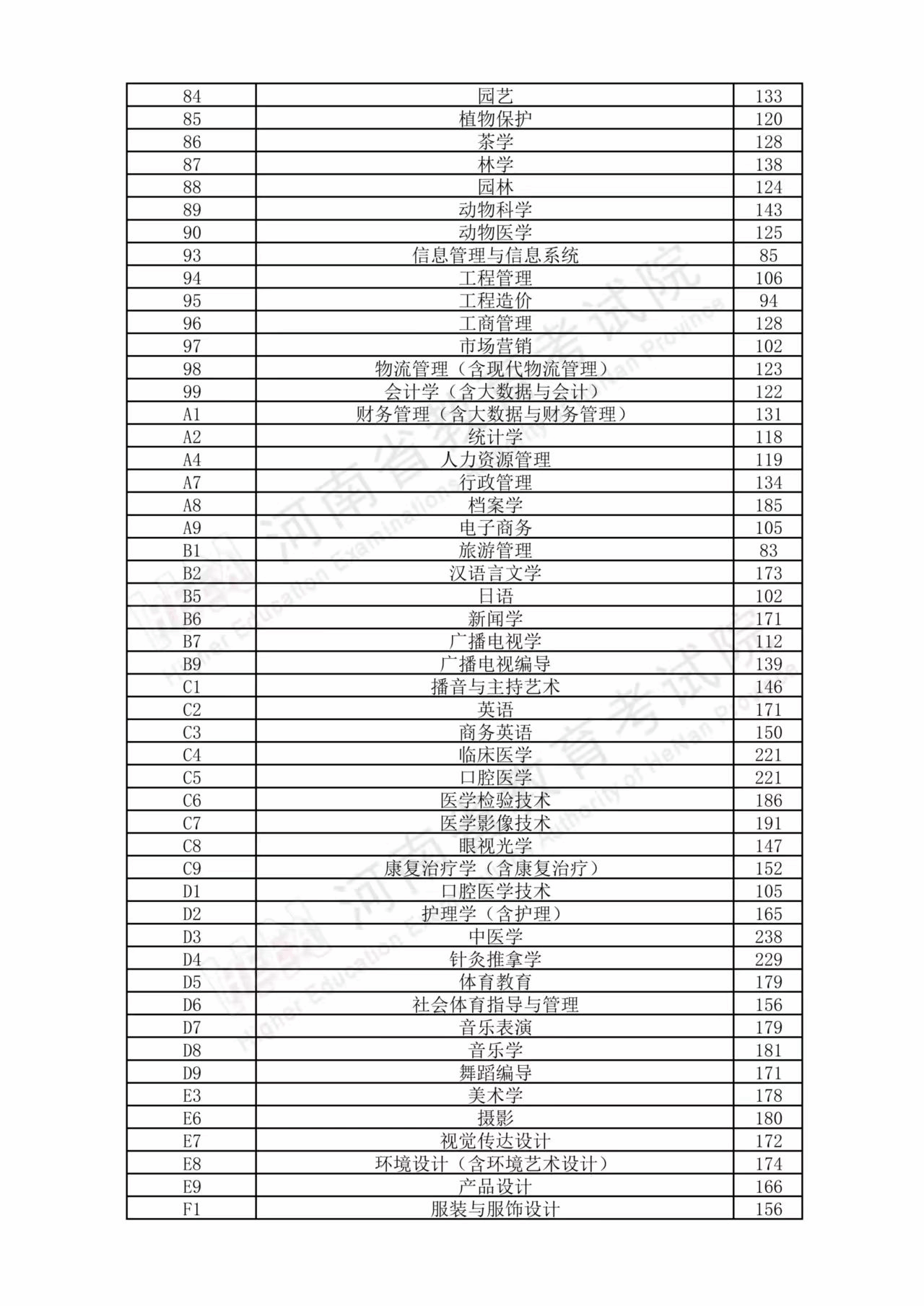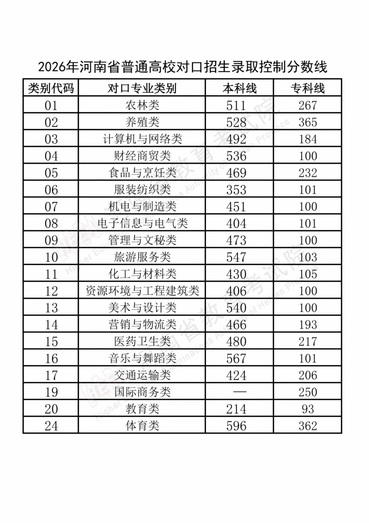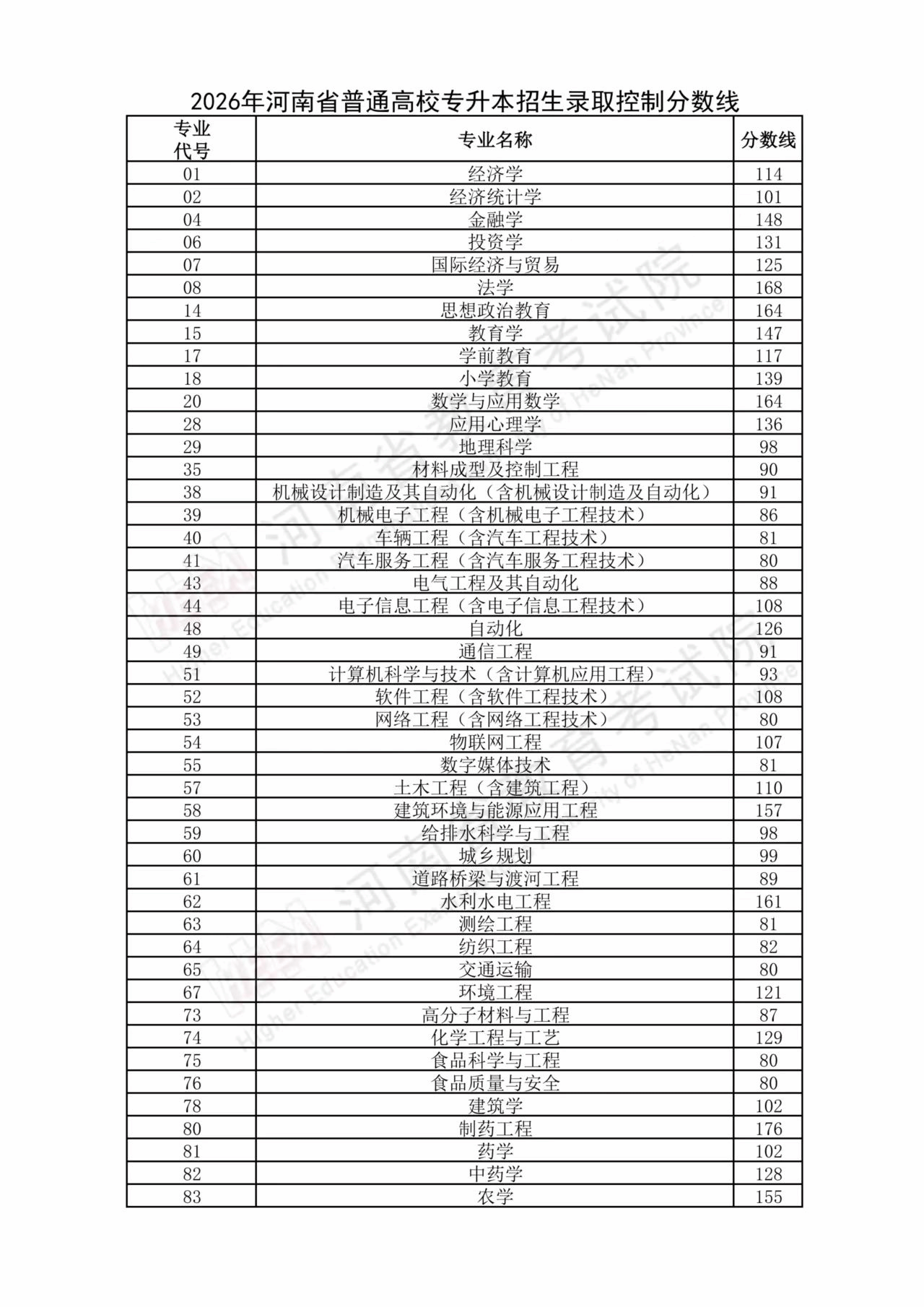 2026年河南省普通高校专升本招生录取控制分数线
