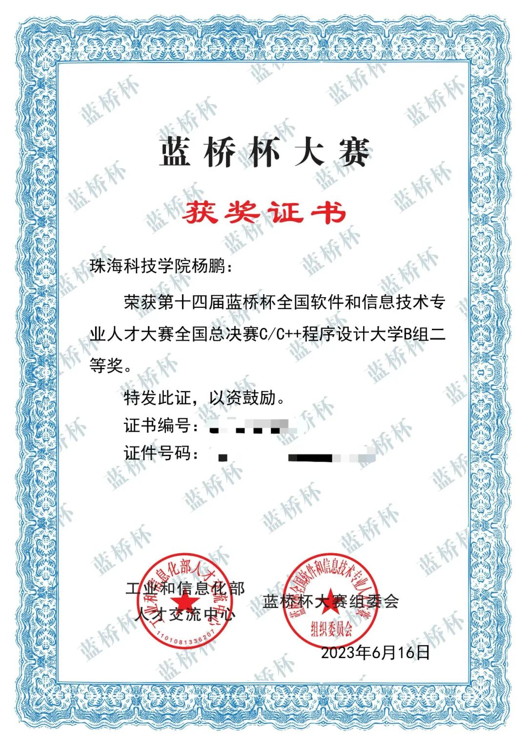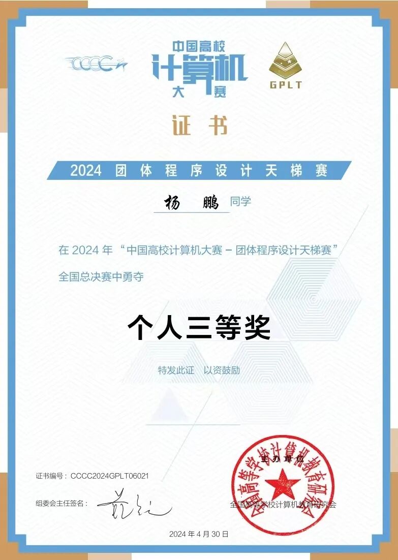 ▲杨鹏参加“中国高校计算机大赛”中获个人三等奖