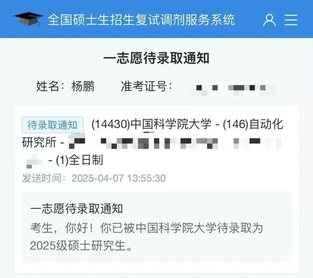 ▲杨鹏中国科学院大学的待录取通知