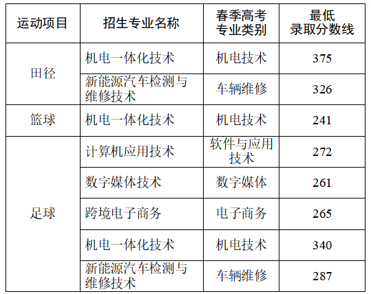 运动专长类各专业拟录取最低分数线