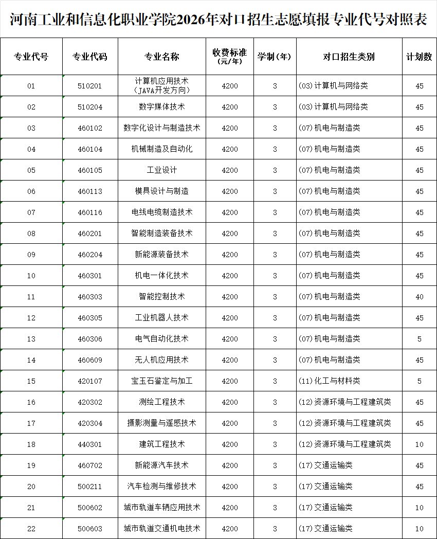河南工业和信息化职业学院 2026年对口招生志愿填报专业代号对照表