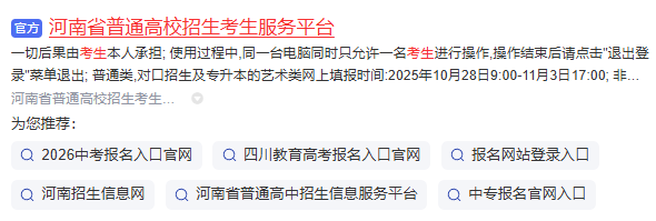 考生登录河南省普通高校招生考生服务平台(https://pzwb.haeea.cn/)系统,或在搜索引擎中输入“河南省普通高校招生考生服务平台”,点击带有“官方”标识的网站。