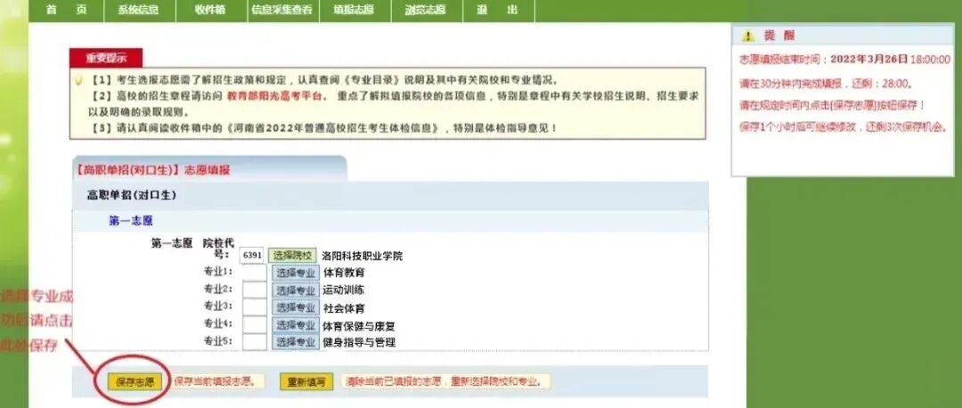 核对志愿信息(院校、专业、代码)无误后,点击页面最下方的「保存志愿」按钮,保存成功才算有效;若信息有误,想重新填写,点击「重新填写」按钮,可清空已填内容,重新填报。