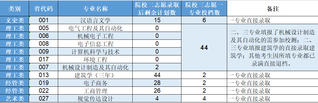 第一专业志愿填报我校文史类、经管类、艺术类、理工类有专业志愿填报建筑学的的考生因本轮投档的考生数少于对应招生专业志愿的剩余计划数,免综合测试,直接予以录取,无需参加本轮综合测试