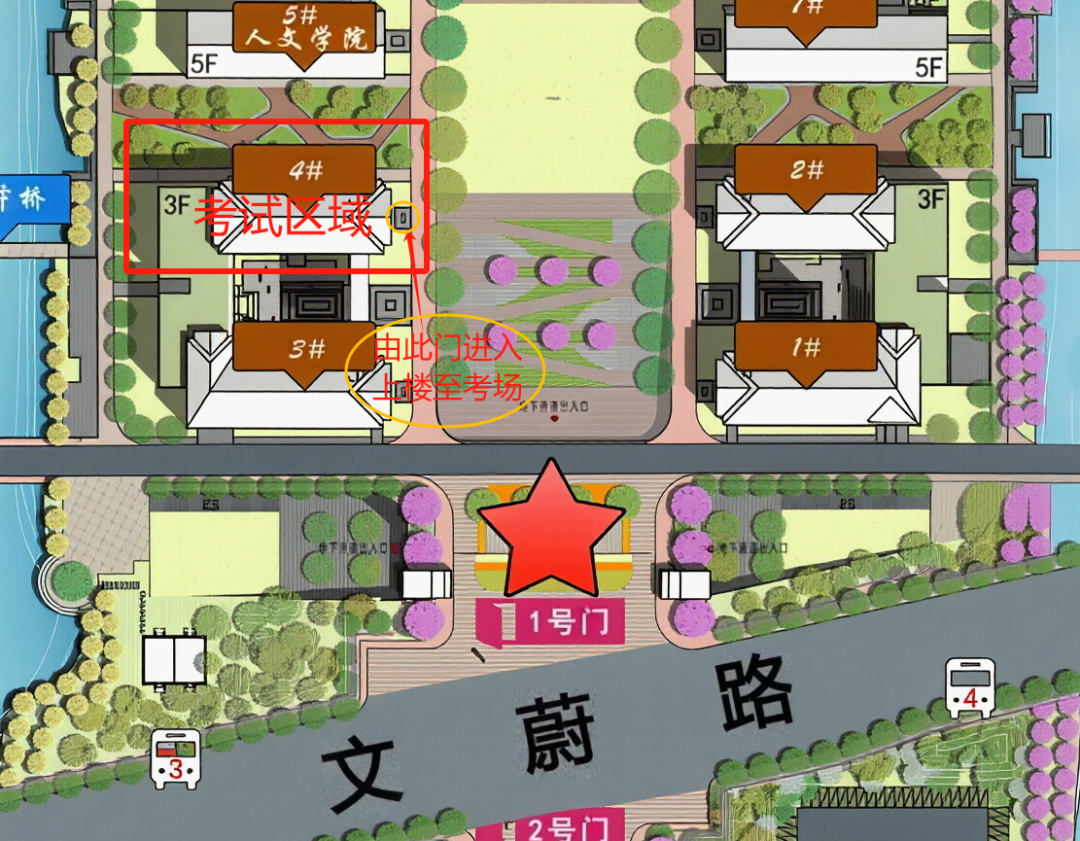 考生从宁大科院1号门(文蔚路)进校,至公共教学楼4号楼进入对应考场。(仅在考试当天进场时间12:30-13:00开放)