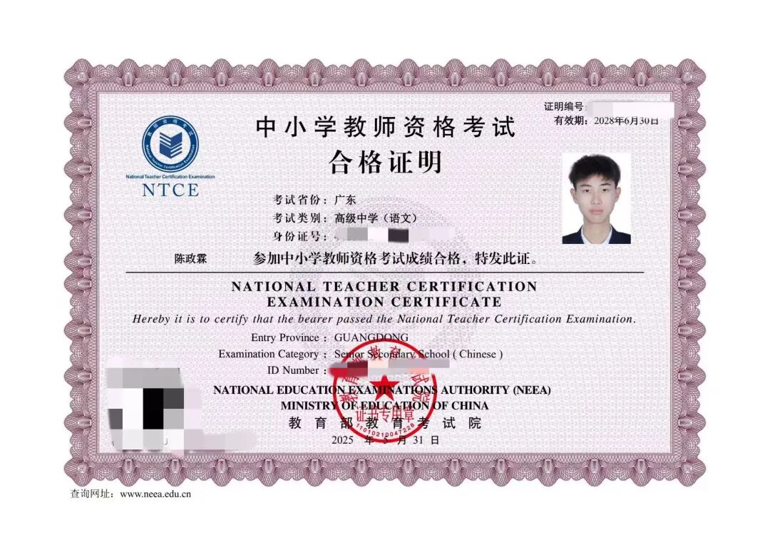 ▲陈政霖考取高级中学教师资格证