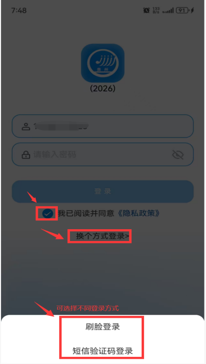 2.登录APP考生在手机上打开【贵州招考】APP,输入本人考生号或证件号或手机号,选择【我已阅读并同意《隐私政策》】,系统默认登录方式为【密码登录】,考生可点击下方【换个方式登录】,选择【短信验证码登录】或【刷脸登录】。