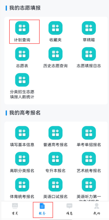 (二)计划查询选择【服务】→【我的志愿填报】→【计划查询】,查询可填报的院校专业计划。