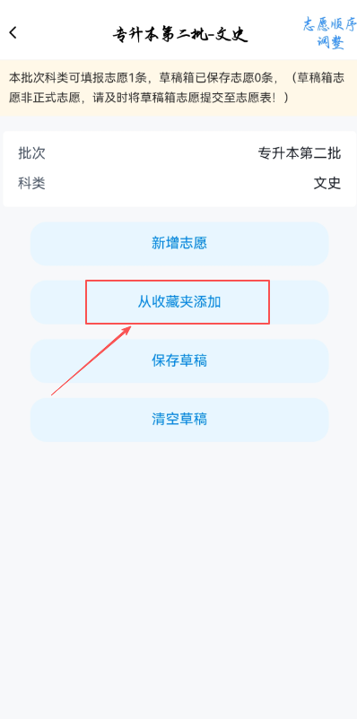 1.添加志愿草稿方式1:通过【服务】→【我的志愿填报】→【草稿箱】进入草稿箱页面,在页面上点击【可填/草稿箱】,选择【从收藏夹添加】。