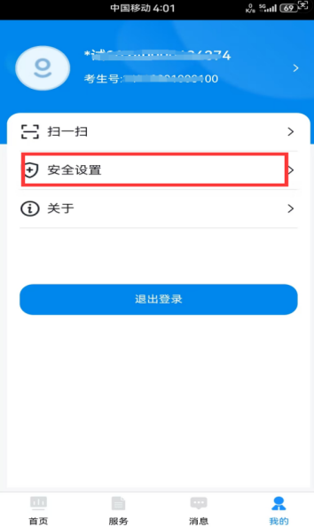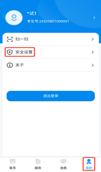 3.修改密码若考生遗忘系统登录密码,可选择【刷脸登录】或【短信验证码登录】方式登录后,通过手机右下角【我的】→【安全设置】→【密码修改】功能,修改登录密码。