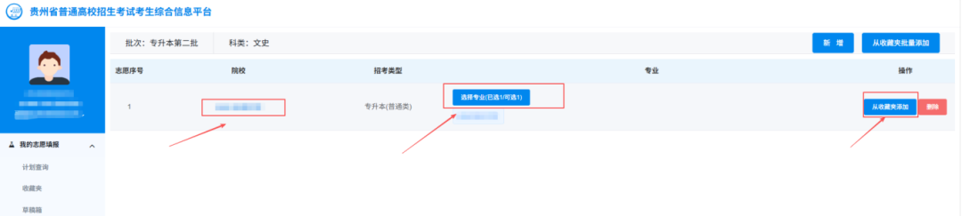 方式1:从收藏夹中添加志愿草稿。通过系统左侧的【我的志愿填报】→【草稿箱】→【编辑】→【从收藏夹批量添加】,可以将收藏夹中的院校专业添加至草稿箱,选择好专业后须点击【保存草稿】。