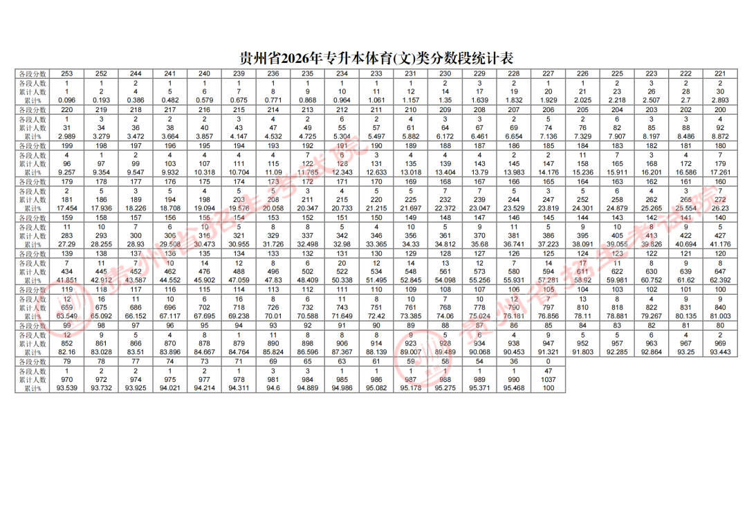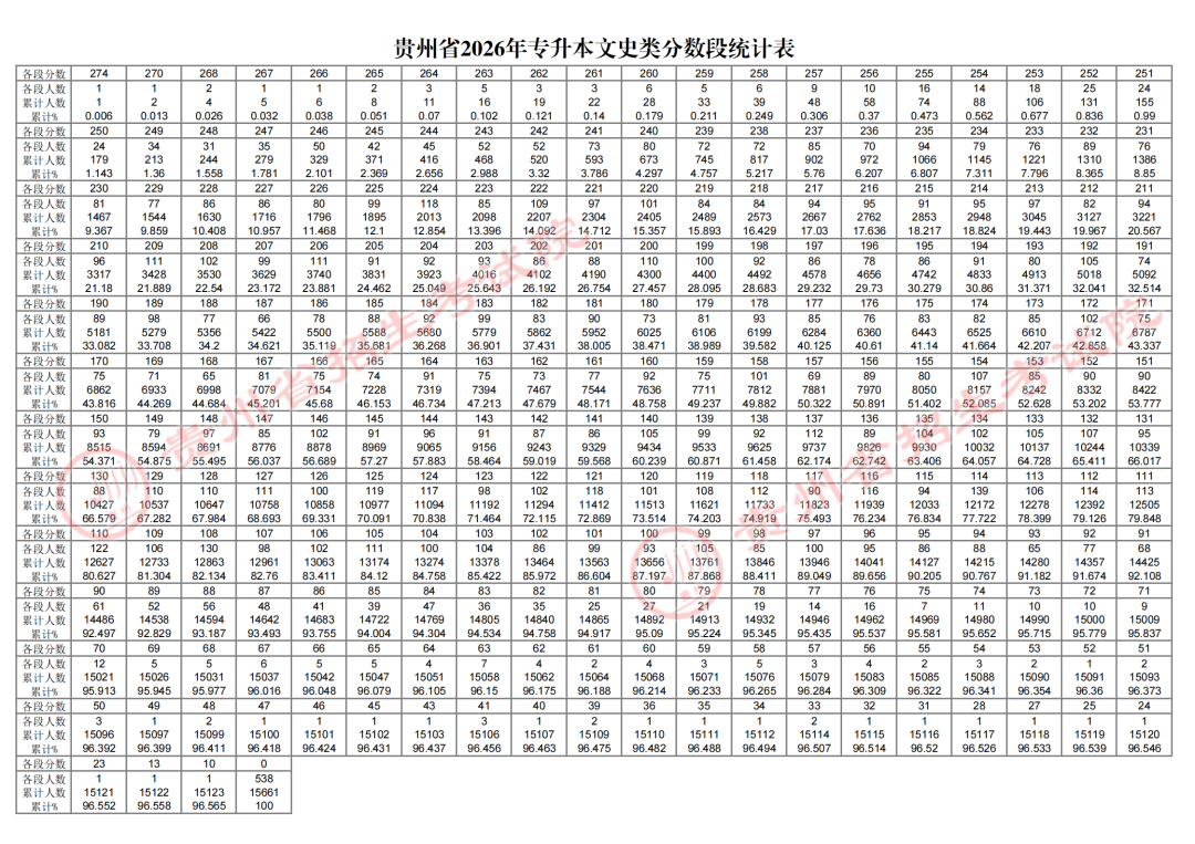 (一)贵州省2026年专升本文史类分数段统计表