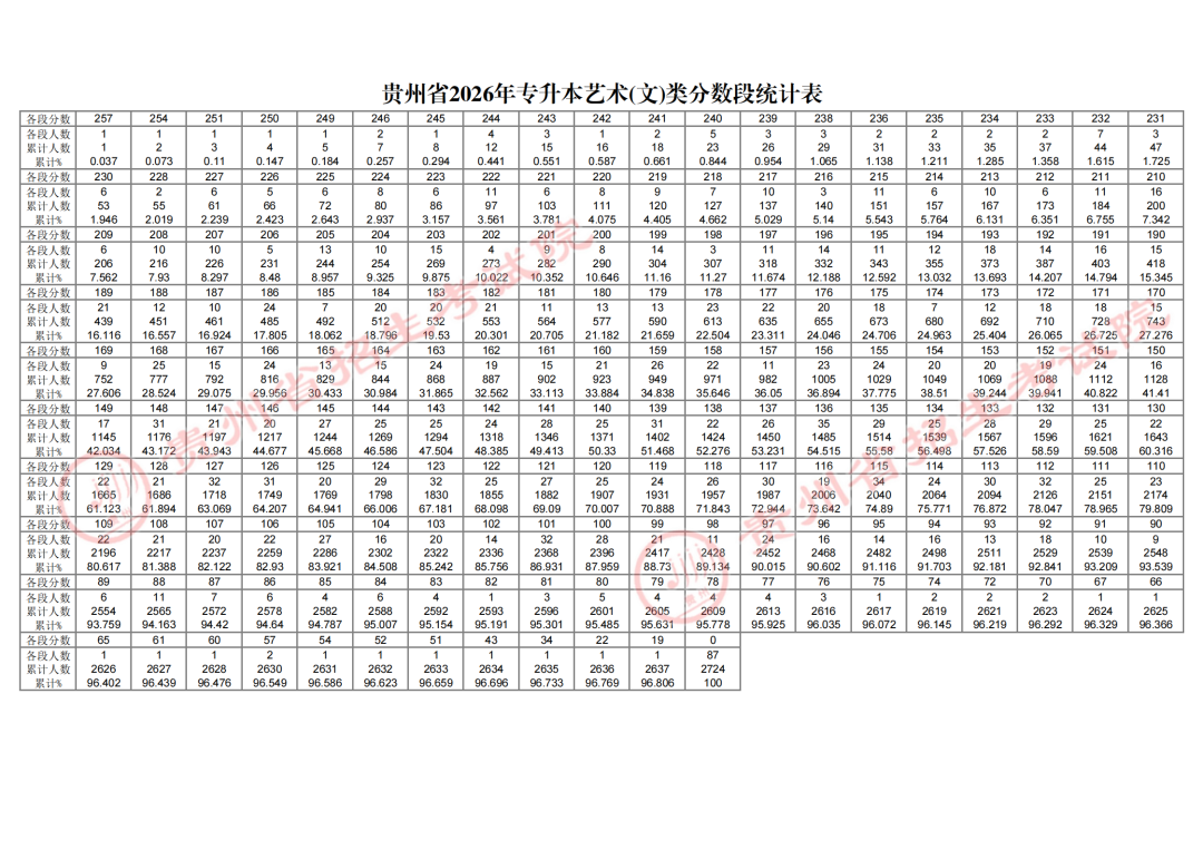 (三)贵州省2026年专升本艺术(文)类分数段统计表