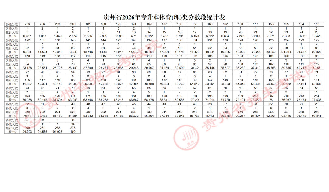 (六)贵州省2026年专升本体育(理)类分数段统计表
