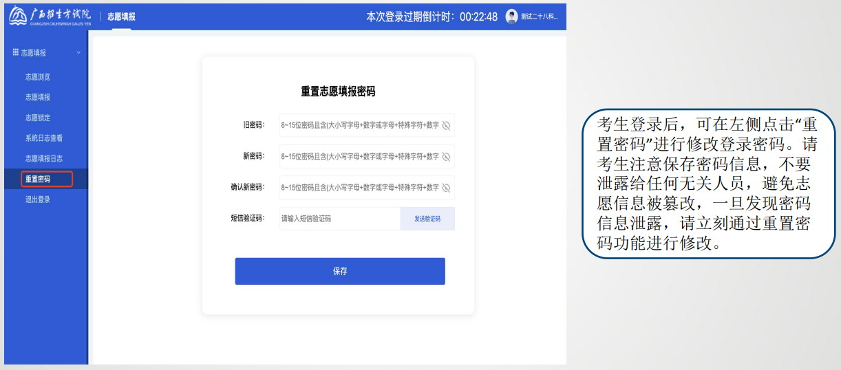 考生登录后,可在左侧点击“重置密码”进行修改登录密码。